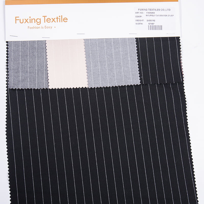 Heim / Produkte / Garn gefärbt Poly Rayon gewebten Stoff mit Stretch / FX55858 Buntes Streifen Design Garn gefärbt anpassen TR Spandex gewebte Stoffanzug und Blazer